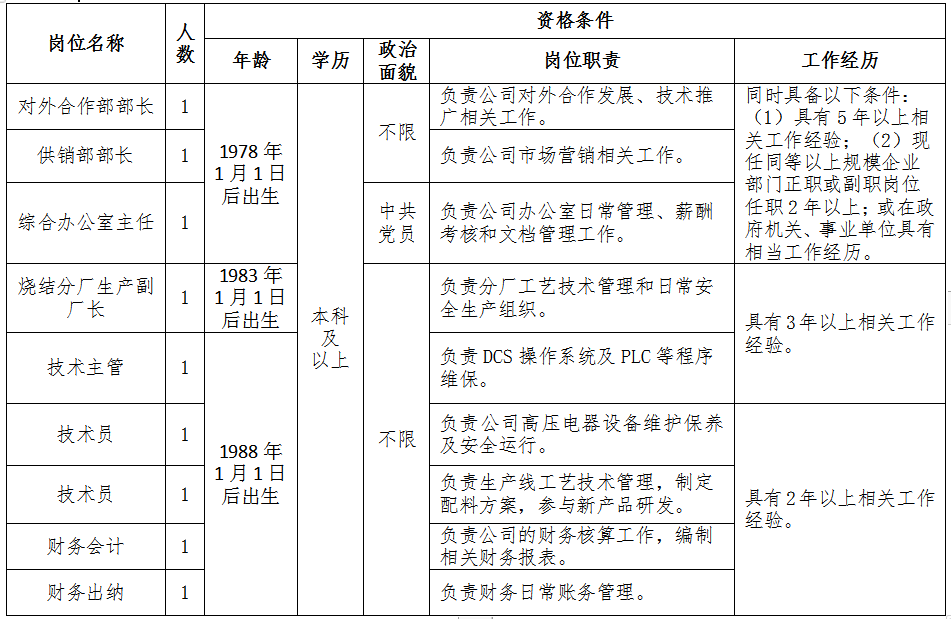 本次招聘9個崗位(見下表)?;春崢I集團在崗人員參加報名的,其資格條件按照《集團公司管理和專業技術崗位管理辦法》第十二條的第三、四、五款執行。其他人員報名按以下資格條件執行。